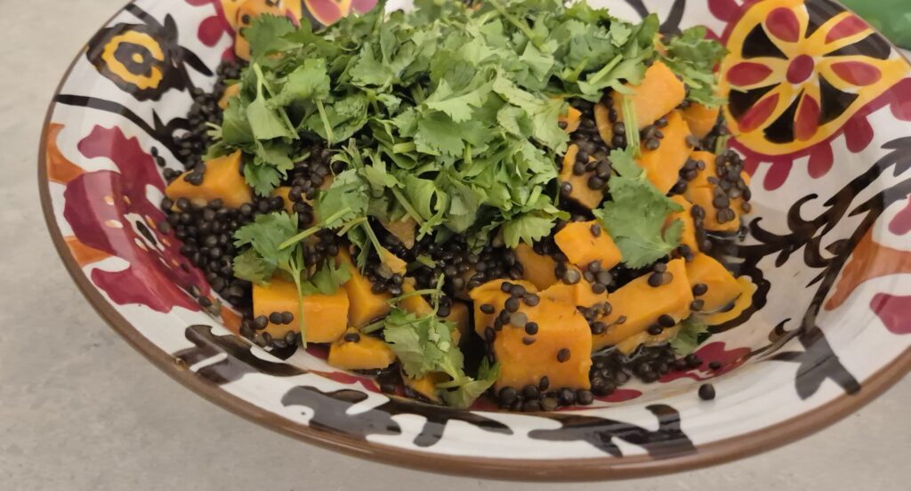 סלט בטטה, עדשים שחורות וכוסברה.